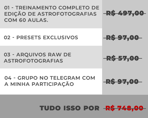Será disponibilizado as Astrofotografias em arquivo RAW para você poder praticar as técnicas ensinadas nas aulas.